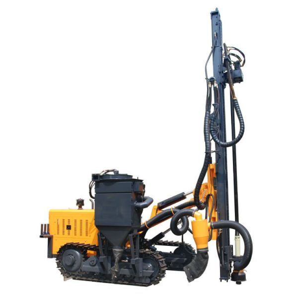 The KH5 high pressure eco-friendly crawler drilling rig is designed on the basis of KY130 drilling rig. A dry type dust collector is added to the KY130 machine. In the dust collecting system, we adopt an imported hydraulic motor and the fan blades are optimized. Thus the system is highly efficient and stable. The prefiltering and fine filtering mechanism are made of eco-friendly and efficient filtering material. The filtering efficiency can reach 99%. The collected dust and powder can be expelled by the excellent automatic control system.